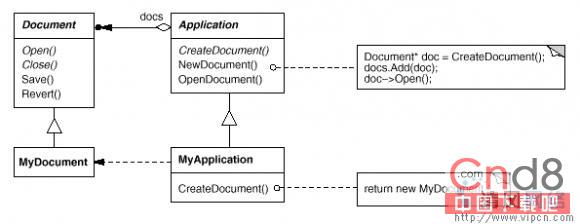 MFC中的CDocument类就包含了类似于上图CApplication中的三个函数。这里的CreateDocument就是一个factory method,因为它负责创建一个文档对象。