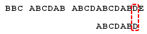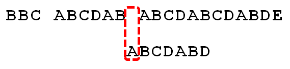 一个基本事实是,当空格与D不匹配时,你其实知道前面六个字符是"ABCDAB"。KMP算法的想法是,设法利用这个已知信息,不要把"搜索位置"移回已经比较过的位置,继续把它向后移,这样就提高了效率。