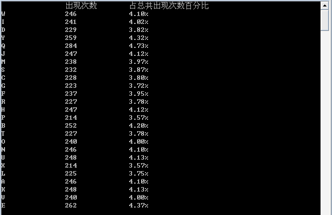 Console.WriteLine("\t\t出现次数\t占总共出现次数百分比");