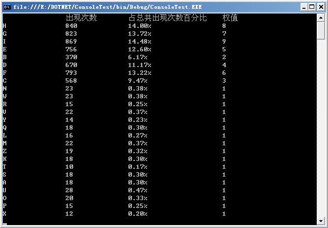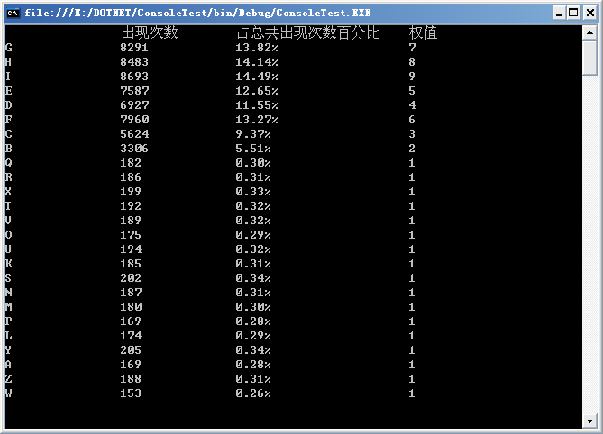 Console.WriteLine("\t\t出现次数\t占总共出现次数百分比\t权值");