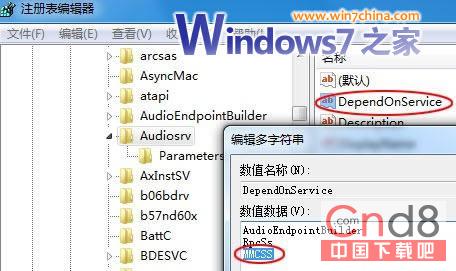 第一步:运行注册表编辑器,依次展开到HKEY_LOCAL_MACHINESYSTEMCurrentControlSet servicesAudiosrv,在右侧窗口中双击“DependOnService”,然后在弹出的对话框中删除“MMCSS删除”。