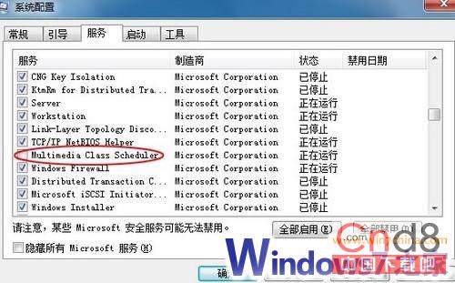 第二步,在开始菜单“搜索程序和文件”框里输入msconfig,在弹出的对话框中切换到“服务”标签下,找到并取消勾选“Multimedia Class Scheduler”。