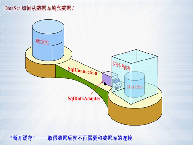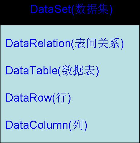 DataSet(数据集)。它表示整个数据库的一个子集,无需跟数据库有直接连接,缓存在机器中,DataSet需要周期性地跟父数据库进行连接,以对数据库和DataSet相互更新。