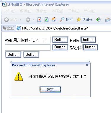 现在我们运行程序,在第一个文本框里输入“开发和使用 Web 用户控件,OK!!!”,点击用户控件中刚添加的客户端 Button 按钮,将弹出一个对话框,显示我们填写的内容,效果如图所示: