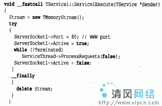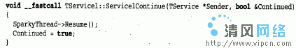 每个服务都有自己的线程(TServiceThread),因此,假如服务应用程序实现多个服务,则必须确定服务实例是安全的线程(thread_safe)。TServiceThread被设计成可以使用TService的OnExecute事件处理程序实现服务,服务线程有自己的Execute方法,它包含一个能在处理新请求之前调用服务的OnStart和OnExecute处理程序的循环。