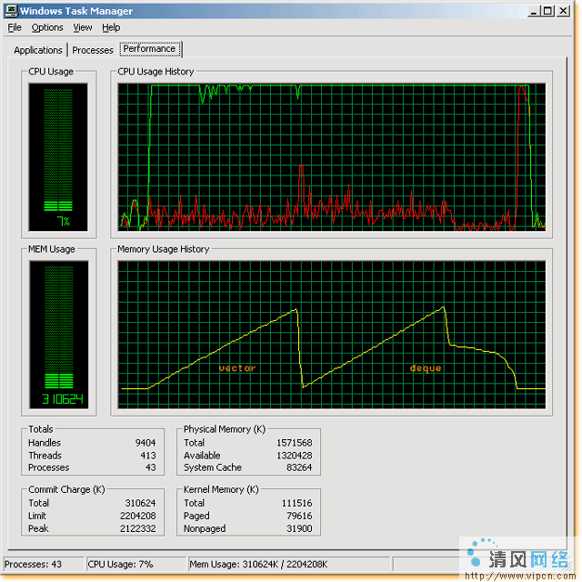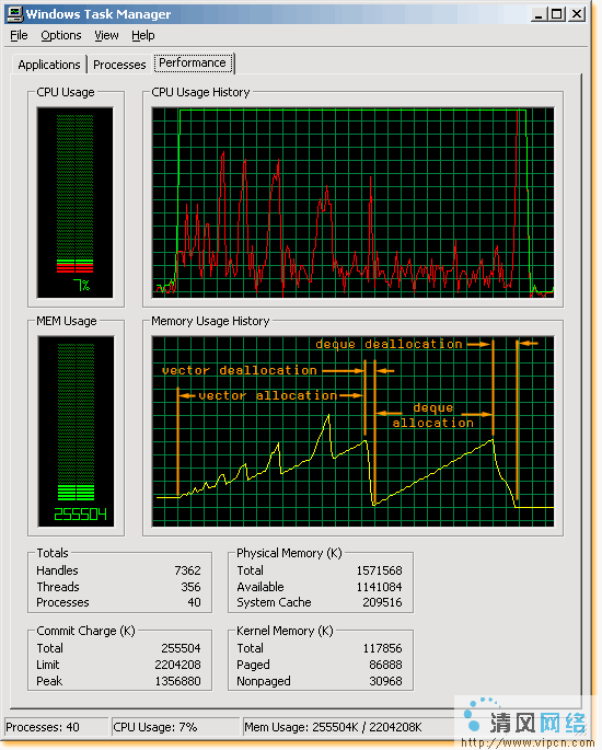 注重在vector分配内存的最高峰,vector在分配内存的时候是怎样达到最高值,deque就是这样的,它在插入数据的同时,内存直线增长,首先deque的这种内存分配单元进行回收的话,存在意想不到的后果,我们希望它的分配内存看上去和vector一样,通过上面的测试我们需要进一步的测试,现提出一个假设:假设deque分配的内存不是连续的,一定需要释放和收回内存,我们将这些假设加入后面的测试中,但是首先让我们从执行的性能外表分析一下这个实验。