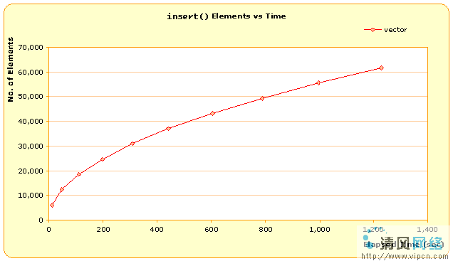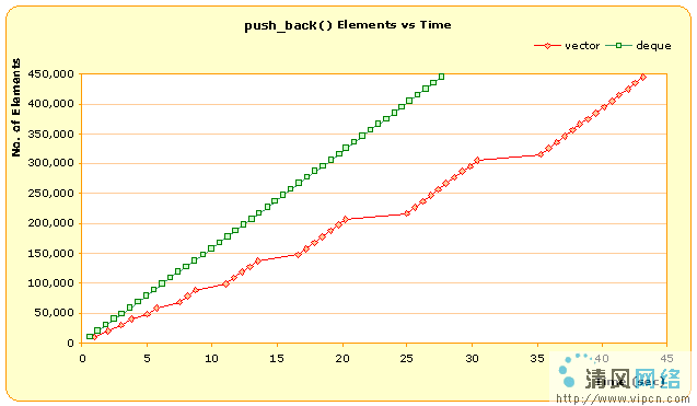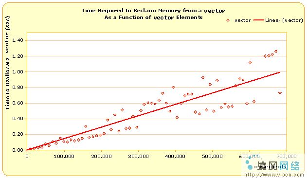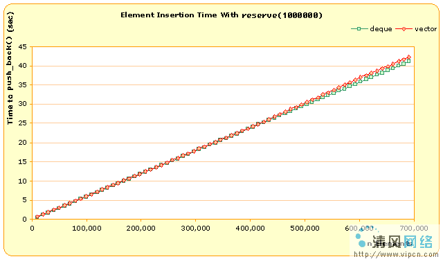 for(xRun=0; xRun { df = new CVectorDequeTest; elapsed_time = 0; for(i=0; i { cout << "Deque - Run " << i << " of " << NUMBER_OF_RUNS*xRun << "... "; df->ReadTestFile("F:huge.csv",DF_DEQUE); deque_data.push_back(datapoint()); deque_data.back().time_to_read = df->GetProcessTime(); elapsed_time += deque_data.back().time_to_read; deque_data.back().elapsed_time = elapsed_time; cout << deque_data.back().time_to_read << " seconds "; } vnElements.push_back(df->GetDequeSize()); cout << " Deleting... "; del_deque.Start(); delete df; del_deque.Stop(); cout << del_deque.GetDuration()/1000000.0 << " seconds. "; vTimeToDelete.push_back(del_deque.GetDuration()/1000000.0); } 结果 本测试和上面两个实验在相同的平台上运行,除了插入的数据由>9874到>691180,需要插入>70次,下面图例显示了>deque在插入数据的时候分配内存的情况,在deque里插入了平均每个长度为>1755.85的字符串。> 尽管从几个曲线图中看到的实际消耗时间不同,但些曲线图都精确到了>R2=95.15%。所给的数据点都实际背离了下表中统计的曲线图数据: deque Results Mean 0.007089269 sec Maximum 11.02838496 sec Minimum -15.25901667 sec Std. Dev 3.3803636 sec 6-Sigma 20.2821816 sec 在相同的情况下比较vector的结果是非常有意义的。下面图就是将vector和deque在相同的情况下分配内存消耗的时间比较图: 这些数据在这个测试中是>R2=82.12%。这或许可以经过每个点反复运行得到更加优化,在这个问题中这些数据适当地标注了这些点,所给的数据点都实际背离了下表中统计的曲线图数据: vector Results Mean -0.007122715sec Maximum 0.283452127 sec Minimum -0.26724459sec Std. Dev 0.144572356sec 6-Sigma 0.867434136sec Photoshop教程 数据结构 五笔输入法专题 QQ病毒专题 共享上网专题 Google工具和服务专题 实验四―― vector::insert() 和 deque::insert() 执行特点比较 目的 deque主张使用参数为常量的insert()。但怎么样能和vector::insert()比较一下呢?本实验的目的就是比较一下vector::insert()> 和 deque::insert()的工作特点。 描述 在容器的容器多次插入数据,在这里可能不符合你的需求,既然这样你可以使用insert(),试验代码也和实验一基本一样,使用insert()代替push_back(),使用insert(>)来测试。 结果 当插入常量给deque的时候,从下图可以看出和vector的对比来。 注重两张图片中时间轴的不同,这是将>61810个数据插入到容器中。 实验五――读取容器的性能 目的 这个实验将测试vector::at(),vector::operator[],deque::at()和deque::operator[]的性能。首先应该是operator[]比at()效率要高,因为它不进行边界检查,同时也比较vector和deque。 描述 这个实验将测试中的容器有1000000个类型为std::string,每个字符串长度为1024的数据,分别使用at()和operator[]这两个操作来访问容器容器的数据,测试它们运行的时间,这个测试执行50次,统计每次执行的结果。 结果 我们看到使用vector和deque访问容器中的数据,他们执行的性能差别很小,使用operator[]和at()访问数据的性能差别几乎可以忽略不计,下面是统计的结果: vector::at() Mean 1.177088125sec Maximum 1.189580000sec Minimum 1.168340000sec Std. Dev 0.006495193sec 6-Sigma 0.038971158sec deque::at() Mean 1.182364375sec Maximum 1.226860000sec Minimum 1.161270000sec Std. Dev 0.016362148sec 6-Sigma 0.098172888sec vector::operator[] Mean 1.164221042sec Maximum 1.192550000sec Minimum 1.155690000sec Std. Dev 0.007698520sec 6-Sigma 0.046191120sec deque::operator[] Mean 1.181507292sec Maximum 1.218540000 sec Minimum 1.162710000sec Std. Dev 0.010275712sec 6-Sigma 0.061654272sec 结论 在这篇文章中我们覆盖了多种不同的情况来选择我们到底是该使用vector还是deque。让我们总结一下测试的结果看下面几个结论。 当执行大数据量的调用push_back()的时候,记住要调用vector::reserve()。 在实验一中我们研究了vector和deque在插入数据的情况。通过这些假设,我们可以看出deque分配的空间是预先分配好的,deque维持一个固定增长率,在vector实验中我们考虑到应该调用vecor::reserve()>.然后在下面这个例子验证了我们的假设,在使用vector的时候调用reserve()能够膀子我们预先分配空间,这将是vector一个默认选择的操作。 当你分配很多内存单元的时候,记住使用deque回收内存要比vector消耗时间多。 在实验三中我们探讨了vector和deque在回收非邻接内存块上的不同,分别证实了vector在分配内存的时候是线性增长,而deque是指数增长,同样,vector要回收的内存比deque多的多,假如你循环调用了push_back(),那么deque将获取大量的内存,而且是临近的。我们通过测试发现在分配内存单元消耗的时间和vector的时间接近。 假如你计划使用insert(),或者需要pop_front(),那就使用deque。 由于vector没有提供pop_front()函数,但在实验四的结果中可以看出没有insert()是非常好的,同时也告诉我们为什么deque在STL类中要作为单独的一个类划分出来。 对于访问数据,vector::at()效率最高。 在实验五中统计的数据表示,所有访问数据方法的效率是非常接近的,但是vector::at()效率最高。这是因为最优的平衡图访问时间为最低的六个西格玛值。 最后 我希望本文能够带你熟悉deque,而且对它感爱好或者一个启发,欢迎继续讨论关于vector和deque任何问题和内容。