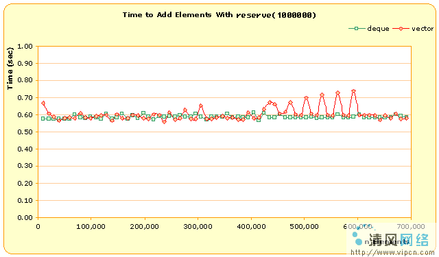 当增加数据的时候对容量的增加在vector和deque执行效率基本一样,然而,vector在插入数据的时候有一些零星的时间消耗,看下面的图例: