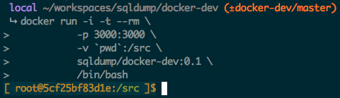 sqldump/docker-dev:0.1 是要运行的docker镜像的名称和版本 – 这跟我们用来构建docker镜像时使用的名称和版本是相同的.