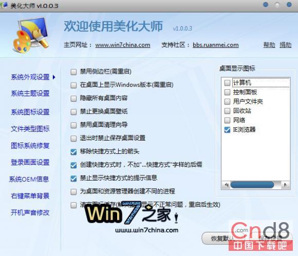在Windows 7中,由于超级任务栏的存在,微软取消了IE 8的桌面图标设置,也就是说,在Windows 7中,无法在桌面显示IE 8图标,当然,快捷方式是不能算的。不过近来有会员在论坛为我们提供了一个很好的办法,可以以"曲线"的方式实现IE 8图标桌面显示。尽管还不完美,但基本的功能都具备了,大家可以通过Windows7优化大师 - 美化大师 - 系统外观来自行设置。