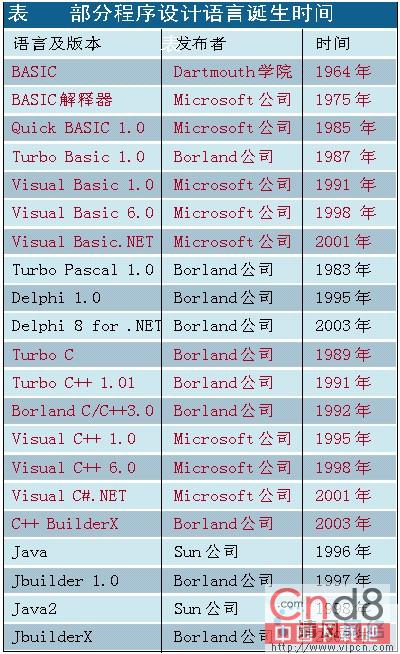 尽管Basic语言诞生较早,但其真正商业化是从1983年开始的。而在这一年,Borland公司又推出了闻名的Pascal编译器Turbo Pascal 1.0,在一定程度上抢了Basic的风头。Turbo Pascal 1.0正式开创了Borland影响PC开发工具十几年的历史。尽管微软也曾经推出了Microsoft Pascal,但无疾而终。随着Turbo Pascal 第9版的推出,Pascal语言也得到了不断的发展。1995年,Borland发布了Delphi,使Pascal成为一种可视化编程语言。Delphi 1.0号称“VB Killer”,又一次在危难的时刻拯救了Borland。 微软和Borland之间的竞争并不只是在Basic和Pascal方面,在C语言世界里也同样如此。早期的C/C++开发环境是Borland于1989年5月发布的Turbo C。同一时期,微软也推出了Microsoft C/C++,不过它直到6.0版,市场反映都一直平平。之后,Borland C/C++ 3.0问世,开启了Borland雄霸C/C++编译器常达五六年之久的序幕。尤其是其3.1版的畅销,使Borland一举击溃了Microsoft C/C++,市场占有率超过了50%。但后来由于Borland决策上的一些失误,随后的4.0和4.5版市场反映极差,相反微软于1995年成功地推出了Visual C++ 1.0,并获得市场好评,它不但在编译器方面能与Borland C/C++ 3.1相抗衡,在整合发展环境方面更加领先。应该说,这是两家公司C/C++战争的转折点,也是C/C++发展的里程碑。在此之后,Visual C++一路高歌猛进到6.0版,并最终发展为.NET时代的C#。不过,Borland也并没有一蹶不振,2003年5月,Borland针对.NET发布了C#Builder,之后又发布了C++ BuilderX。 说到编程语言,不能不说Java。Java是Internet时代的产物,同其他前辈语言相比,其最大的特色在于“一次编码,多处运行”。Sun公司是Java语言的缔造者,但对Java开发环境做出最大贡献的是Borland的JBuilder系列产品。1997年,Borland发布JBuilder 1.0,进军Java跨平台开发。这之后,微软曾试图染指Java开发环境市场,并影响Java的技术发展,并在Visual Studio系列中,将Visual J++从1.0直接跨越到6.0。但是,JBuilder至今仍控制着Java的开发环境市场。