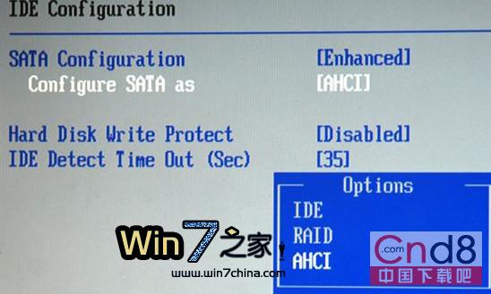 如果你的主板支持AHCI,那么请在安装Windows7前进入Bios设置,在Advanced选项中将SATA controller Mode中默认的IDE调整为AHCI。