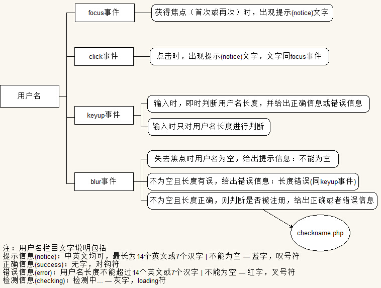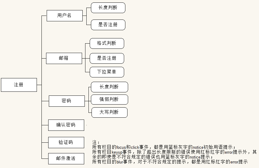 写了一个简单的PHP+jQuery注册模块,需要填写的栏目包括用户名、邮箱、密码、重复密码和验证码,其中每个栏目需要具备的功能和要求如下图: