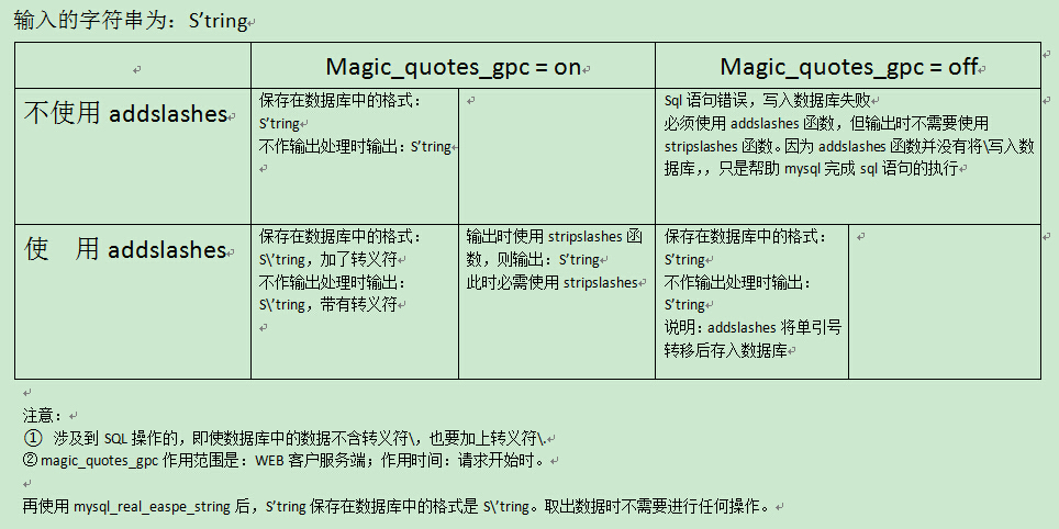 关于数据库防注入的几种方式magic_quote_gpc,addslashes/stripslashes,mysql_real_eascpae_string,我做了一张表格