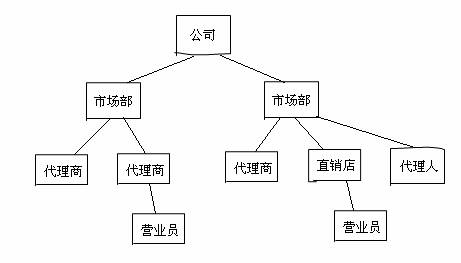 刚才的情况里面,聚合类和元素类都是同样的类型。也有些情况他们分别属于不同的类型。比如一个企业,他的营销网络是由下面一些元素组成的:公司,市场部,直销店,代理商,自由代理人,营业员。如同下面的情况: