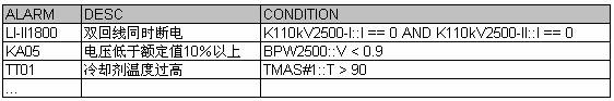 表里面的CONDITIONA字段表示告警条件,这是一个公式,判断的时候把信号的数值代入,然后判断公式条件是否得到满足。如果满足条件,就产生一个告警。