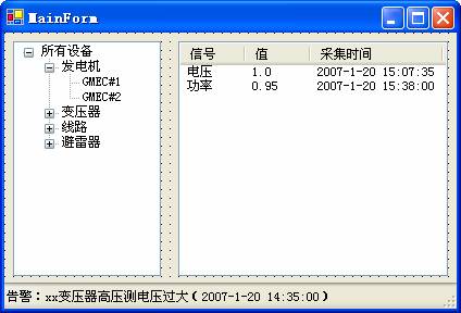 界面的左侧是一个树,表示设备的分类关系,每个叶子表示一个设备;当鼠标在树上点击一个设备,右侧的列表视图上显示这个设备上的信号和采集数据;如果设备上有告警,对应的树节点要标示一个显著的颜色,并且状态栏上要显示最近的告警。