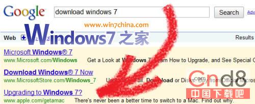下面是在Google搜索引擎中搜索“download windows 7”或“windows 7 download”时看到的苹果广告。这个广告的标题是“升级至Windows 7吗?”,而副标题则是“现在是更换至Mac的最好时机,请看详情”,hoho,无孔不入了。前面两个广告是微软自己的,一个是微软自己的Windows7官方网站,一个是微软商店的Win7产品销售链接。