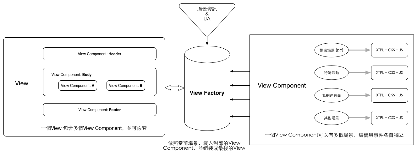 在这个方案里面,Router、Controller 和 Model 都无需关注设备信息,终端类型的判断完全交给展现层来处理。图中主要的模块是「View Factory」,Model 和 Controller 将数据和渲染逻辑传递过来之后,通过 View Factory 根据设备信息和其它状态(不仅仅是 UA 信息、也可以是网络环境、用户地区等等)从一堆预设好的组件(View Component)中抓取特定的组件,再组合成最终的页面。