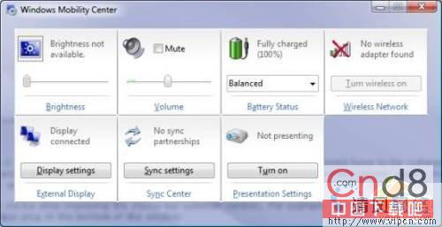 留意观察,4个按钮上的文本颜色显示不正确,并且每个按钮外围都有一个不透明的矩形。通常来说,透明性与子窗口不会配合得非常好,假如想要一个全为毛玻璃效果的对话框,那么控件部分就需要以一个不透明的背景来绘制,如"Windows Mobility Center"程序: