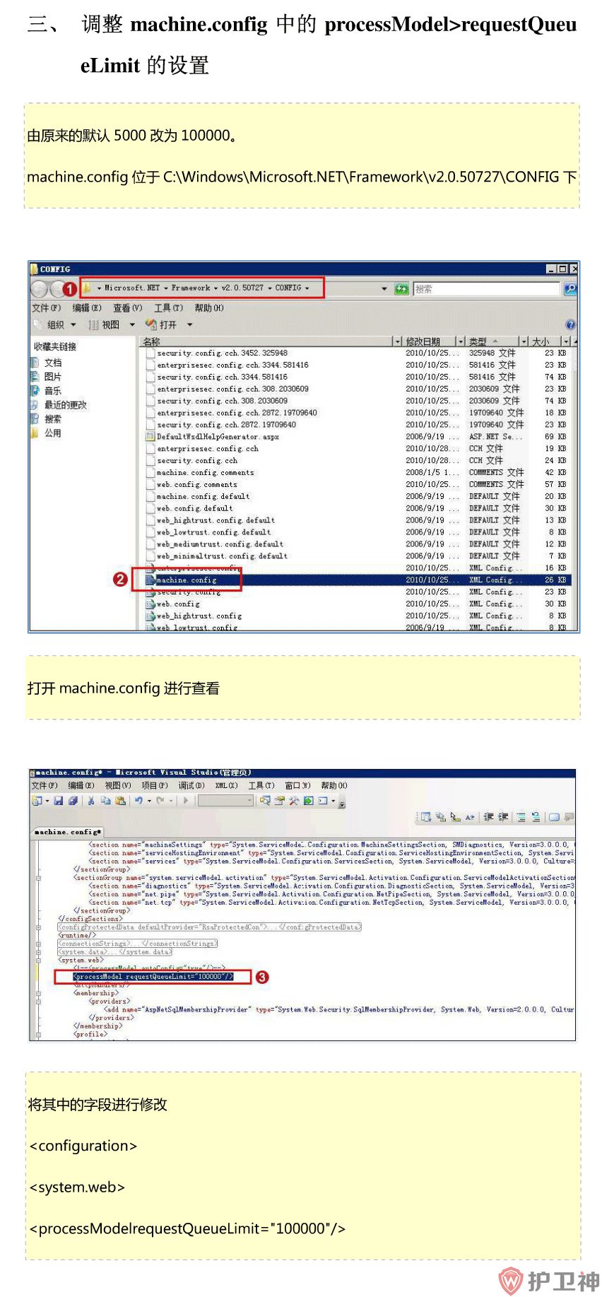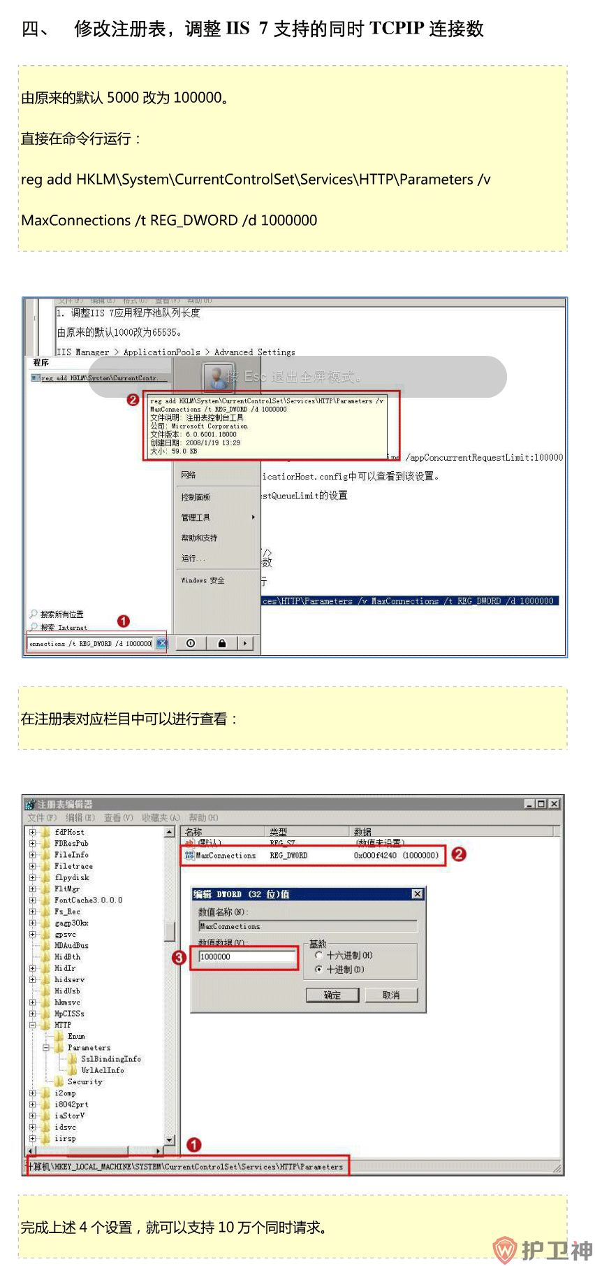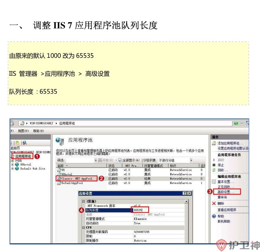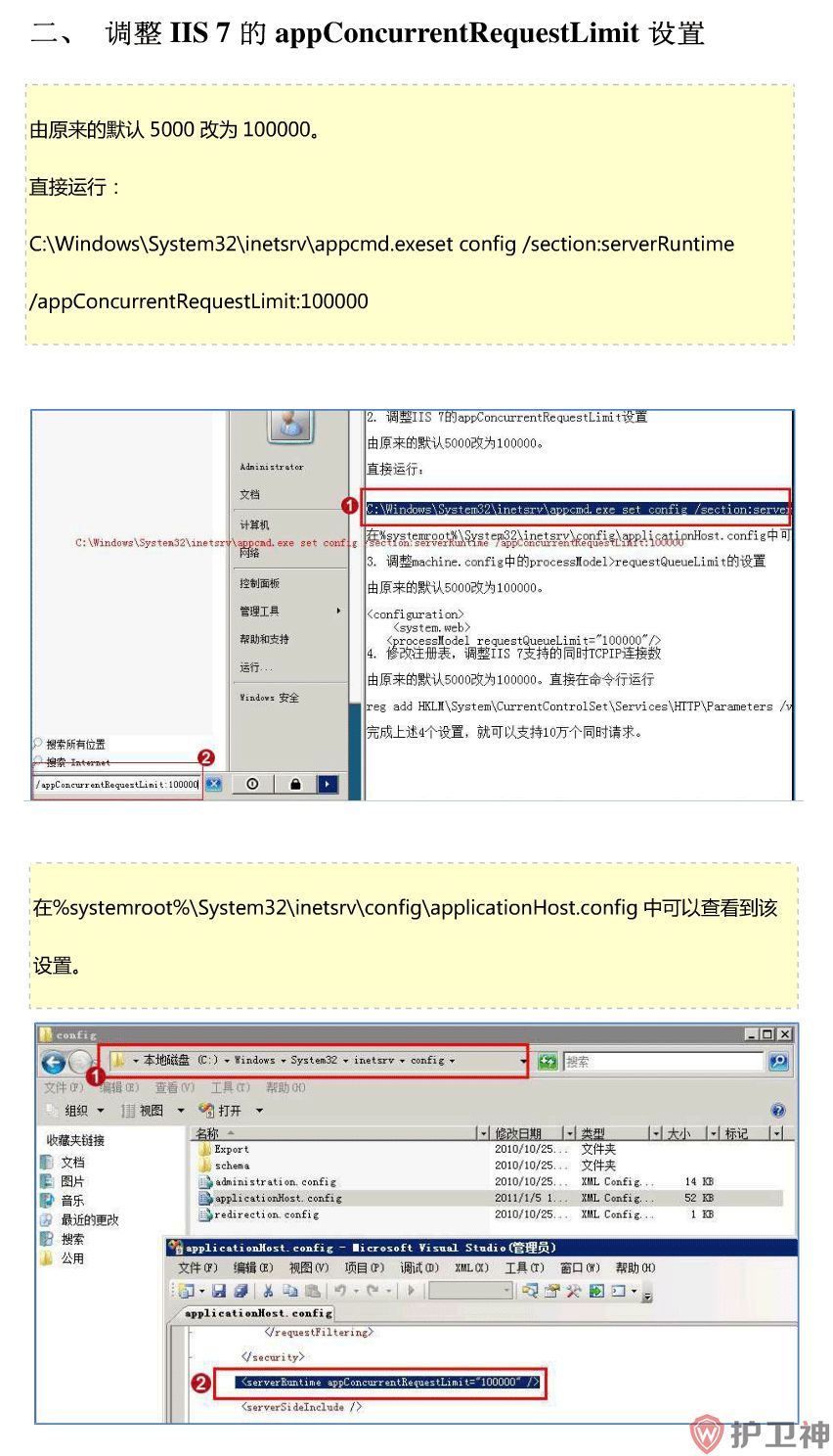 通过对IIS7的配置进行优化,调整IIS7应用池的队列长度,请求数限制,TCPIP连接数等方面,从而使WEB服务器的性能得以提升,保证WEB访问的访问流畅