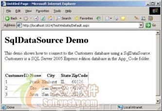 有几点要注意:首先,ConnectionString属性使用了新的句法<%$ ... %>。这个句法从Web.config文件中检索ConnectionStrings节的值的CustomersConnectionString值。换句话说,它从Customers数据库中获取连接串-该串是我们在Sql数据源控件的向导的子步骤中保存下来的;其次,SELECT查询语句是在控件的SelectCommand属性中指定的。