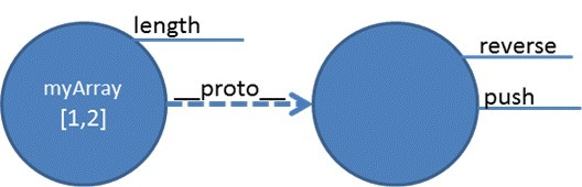 图 3 还展示了每个数组对象同时也可以维护自身的状态和成员。在请求得到 myArray 的 length 属性的情况下,JavaScript 会取得 myArray 中 length 属性的值,而不会去读取原型中的对应值。我们可以通过向对象上添加 push 这样的方法来“重写”push 方法。这样就会有效地隐藏原型中的 push 方法实现。