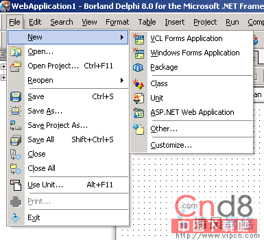 说明一下,在Delphi8里VCL.net的可视化控件(可能是Tcomponent以下)与.net的可视化控件并不能混用。要么建立VCL Application要么建立WinForm Application 或是Asp.net Web Application,你建立VCL Application与建立WinForm Application后在控件面板中的可用控件是不同的。一个Tform或是Tedit不能用于WinForm Application中,反之同样,据说这是VcL.net可视化控件与Microsoft.net控件的消息机制不同的原因(在台湾深度论坛中看到过有类似讨论)。另外除了与VS.net相同的.net组件外,Borland自已还提供了一些.net组件可用于WinForm Application和Asp.net Web Application。