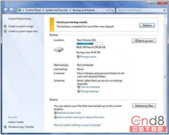 当你打开备份与还原中心,你将会看到在左边窗口有创建系统镜像(系统镜像是一种可以用来进行Windows7裸机恢复的备份)和创建系统修复光盘两个选项,如下图1所示。