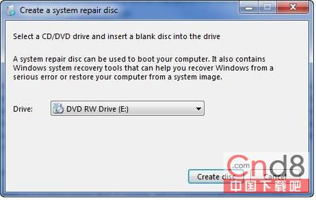 将空白的可写DVD盘放入你的计算机,点击备份与还原中心的“创建系统修复光盘”就可以创建一张系统修复光盘了。当你点击后,Windows将会提示图3的对话框。通过从下拉列表来选择你的DVD驱动,然后点击“创建磁盘”来完成全过程。