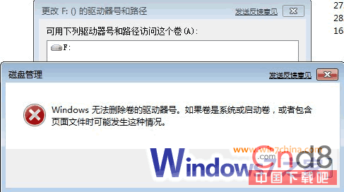 既然隐藏分区是为了保护系统引导文件,下面我们进行测试看是否可以取消刚才为其赋予的驱动器号。右键单击该分区选择“更改驱动器号和路径”,尝试“更改”或者“删除”驱动器号都显示“无法删除/更改卷的驱动器号”,其原因是改卷是系统或者启动卷。由此可见,为Windows 7中的这个特殊的隐藏分区添加驱动器号的过程是不可逆的。