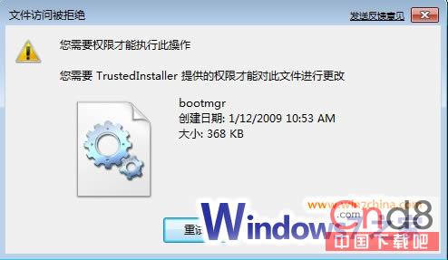 下面我们尝试删除该分区中的系统引导文件会怎样。笔者以administrator登录系统,进入F分区然后进行文件删除。在删除的过程中发现,其中有些文件是无法删除的,显示“文件正在使用”或者提示“没有删除权限”。然后又尝试了为administrator赋予“完全控制权限”,结果被拒绝。经过测试发现就连system没有完全控制权限,只有TrusterInstaller用户才有完全控制权限。该用户是Windows 7中特有的,其任务是单一的与系统安装有关,在Windows7的用户和组(lusrmgr.msc)中是没有该用户的。下面我们看看,在删除了该分区中的某些文件之后是否会影响系统启动。重启系统,没有问题系统正常启动。可见,我们刚才删除的文件与系统启动无关,而真正与系统启动相关的文件是无法删除的。