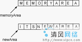 memoryArea 和 newArea 分别被分配了 10 个字节,它们各自的内容如图 4 所示。假如某人执行如下所示的语句(指针重新赋值)……