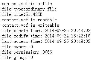 代码中还用到了文件权限、所在组等函数,有必要解释下(说的不对请修正)。一个文件的权限分为可读可写可执行,一般这样表示:rwx,字母对应的表示可读可写可执行,从前往后规定值为4、2、1,三个值相加的结果最大为7,因此0666用的是八进制表示,这样看起来就很方便。为7则表示这个文件具备这三个权限,那为什么打印的是0666呢?我们都知道,进入windows下面是有一个用户的,在Linux下边,与windows类似,也是有一个用户登录进去,因此一个文件可能为该用户所有,一个用户它还有自己所在的组,以及该系统中还有其他组(猜想这样分应该是管理上的需要),因此对于0666,对于第一个6,表示该用户对该文件的权限,第二个6表示该用户所在的组对该文件的权限,第三个6表示其他的组所具有的权限(这样就不用一一去区分除本组外其他的用户了),6就知道该文件是可读可写的(win下可执行都知道是.exe文件)。