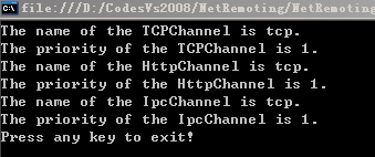主进程通过配置获取远程对象的信息,为远程对象创建代理,代理的优势在于不仅可以跨域访问对象还可以跨进程,和系统,使用TCP通道,降低系统耦合性.最后客户端通过代理访问远程对象的方法,输出结果.首先要运行服务器端,其次是客户端,IDE使用的是Visual Studio 2005/2008.其次注意项目引用.运行后的结果显示如下.
