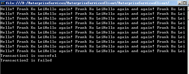 Transaction1执行成功,Transaction2执行失败.ContextUtil.SetAbort();设置上下文环境的状态信息,事物终止,该语句使所有的数据库操作回滚,数据库未增加新记录.