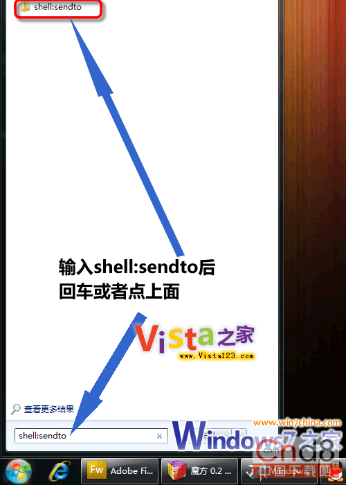 一、打开开始菜单,在搜索框里面输入shell:sendto然后回车,看看,是不是一下子就打开了发送到菜单项所在的那个SendTo文件夹?