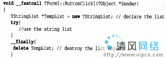 若只需在单个例程中使用串列表,可在同一地方创建、使用并析构串列表。这是使用串列表最安全的方法。由于串列表对象会为本身及其字符串分配内存,所以应使用try...__finally程序块来确保即使发生异常也能释放其内存。