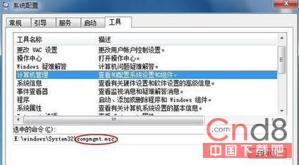 点击Windows7开始按钮,在“搜索程序和文件”中输入“msconfig”,回车打开“系统配置”窗口,切换到“工具”标签下,然后用鼠标任意选中某工具名称。此时,在“选中的命令”栏中即可出现对应的命令路径(如上图)。其中,红色圆圈内就是对应的调用某系统组件、功能等的命令。