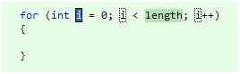 不仅有了for的基本代码,还定位到了变量的名字处,如果需要可以修改变量名,假设改为index,后面的两个i会自动改为index,然后按Tab,光标会跳至下一个深色显示的地方,即length,这里可以修改index的上限,然后回车,光标会跳至for循环的代码体: