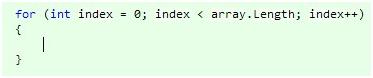 VS的开发者想的很周全,提供了Code Snippet功能,从而实现了上面的想法。它保存了for循环代码的模板,然后给它一个快捷键for。现在在编辑器中(需要是C#文件),输入for,连续按两下Tab键,就会出现下面的代码: