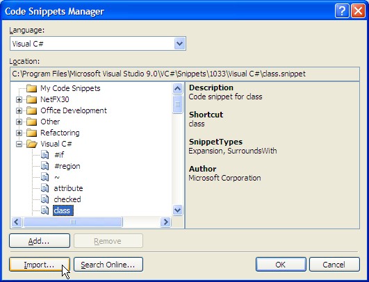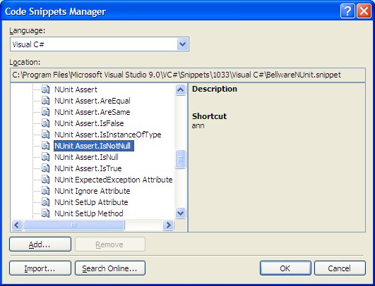 可以看到上面的Language列表,现在选中的是C#。可以通过Import方式来导入新的Snippet。在使用NUnit时,由于测试代码的特点,会有很多重复输入,所以Scott Bellware提供了NUnit的Snippet,我把它放在自己的博客来了:BellwareNUnitSnippet。现在把包里的.snippet文件导入。