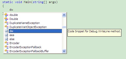 是不是很方便呢?还有很多其它Snippet,比如输入cw,按两下Tab就出来Console.WriteLine()。