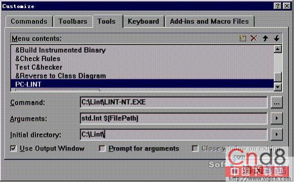 完成后,在tools菜单下就会有一项PC-LINT选项。下面是TOOL配置图: