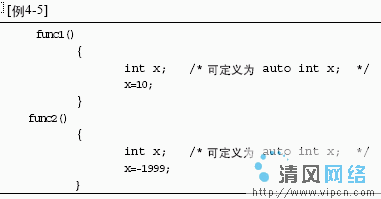 语言中包括了要害字auto,它可用于定义局部变量。但自从所有的非全局变量的缺省值假定为auto以来,auto就几乎很少使用了,因此在本书所有的例子中,均见不到这一要害字。