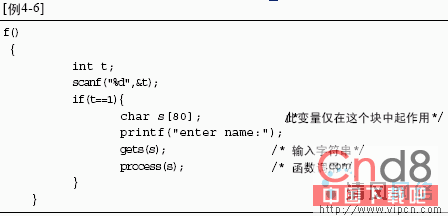 这里的局部变量s就是在if块入口处建立,并在其出口处消亡的。因此s仅在if块中可知,而在其它地方均不可访问,甚至在包含它的函数内部的其它部分也不行。