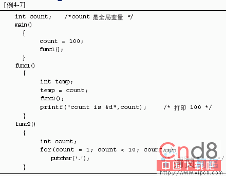 仔细研究此程序后,可见变量count既不是main()也不是func1()定义的,但两者都可以使用它。函数func2()也定义了一个局部变量count。当func2访问count时,它仅访问自己定义的局部变量count,而不是那个全局变量count。切记,全局变量和某一函数的局部变量同名时,该函数对该名的所有访问仅针对局部变量,对全局变量无影响,这是很方便的。然而,假如忘记了这点,即使程序看起来是正确的,也可能导致运行时的奇异行为。