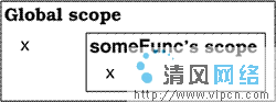 读入 x 的语句指涉 local 变量 x,而不是 global 变量 x,因为内层作用域的名字覆盖(“遮蔽”)外层作用域的名字。我们可以像这样形象地表示作用域的状况: