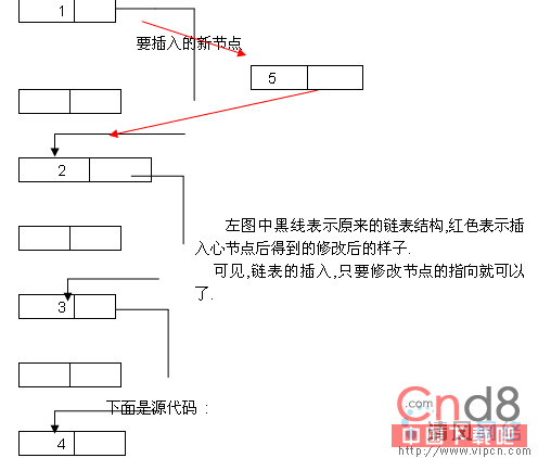 对于链表的插入方法,很灵活,不用象数组一样插入后,还要向后移动其后面的数值.下面是一个示例图: