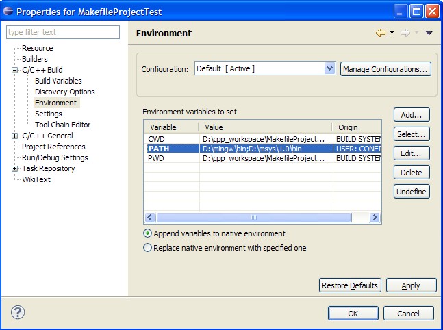 9. Ok, 选中工程,点Build(或点那个小锤子),你会发现这个错误:(Cannot run program "make": Launching failed),啊,我们的make.exe还没设。选中工程,直接Alt-Enter到工程属性页,把msys的bin加到Path里。